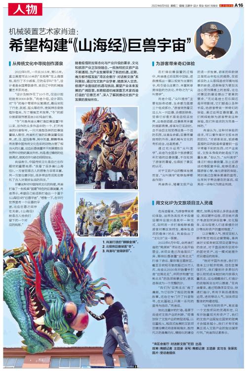 随着疫情防控常态化与产业升级的要求,文化和旅游产业正加快融合。一批独特的文旅产品不断涌现,为产业发展带来了新的机遇。近期,南方都市报发起“湾区会客厅·对话新文旅”系列策划,通过与文旅产业学者、精英深入交流,梳理产业面临的机遇与挑战,展望产业未来发展的广阔前景。本期报道机械装置艺术家肖迪打造的“巨兽艺术”,深入了解其推动文旅产业发展的奥秘所在。