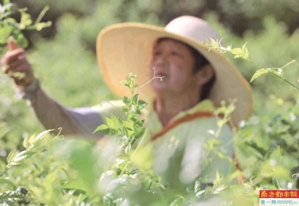 张家界市武陵源区莓茶种植基地,茶农在高温下采摘鲜叶。