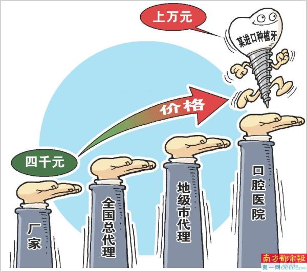一颗种植牙从出厂到医院,要经过厂家、全国总代理、地级市代理再到医院等多个环节,每个环节都会产生相应的成本,导致种植牙被层层加码,一些有植牙需求的患者只能“望牙兴叹”。