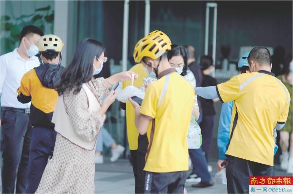 在广州市天河区珠江新城,外卖小哥为顾客送餐。 南都拍客 欧伟伦 摄