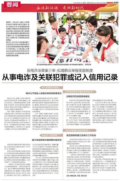 南都讯 8月26日,全国人大常委会法制工作委员会举行记者会,发言人杨合庆介绍,反电信网络诈骗法草案三审稿加大对电信网络诈骗违法犯罪人员的惩戒力度,增加规定对从事电信网络诈骗犯罪及关联犯罪的人员,可