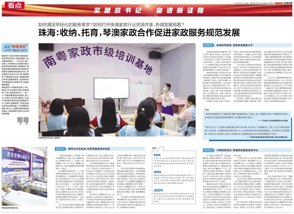 邀请澳门专家为珠海“南粤家政”师资培训班开讲、对家政服务人员开展岗前培训……8月12日,由广东省人力资源和社会保障厅联合南方都市报发起的“南粤家政”高质量发展深调研媒体采风团走进珠海市与横琴粤澳深
