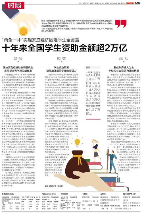 昨日,在教育部新闻发布会上,教育部财务司司长郭鹏在介绍学生资助工作情况时表示,十年来,国家逐步提高各学段资助标准,扩大资助范围,实现了家庭经济困难学生全覆盖,为促进教育公平发挥了关键作用。 目前