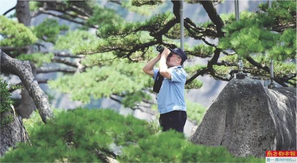 8月14日,胡晓春在例行巡查中用望远镜查看迎客松情况。 新华社发