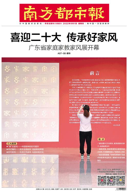 昨日,“喜迎二十大 传承好家风”——广东省家庭家教家风展在广东画院开幕。 南都记者 冯宙峰 何玉帅 摄 三大篇章 ●“典”论家风——中国精神的时代精华