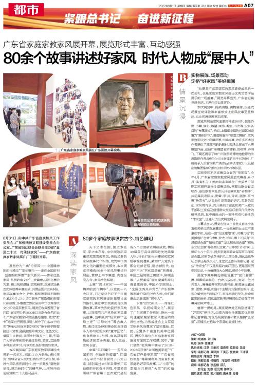 8月31日,由中共广东省直属机关工作委员会、广东省精神文明建设委员会办公室、广东省妇女联合会联合主办的“喜迎二十大 传承好家风”——广东省家庭家教家风展在广东画院开幕。 展览分为“‘典’论家风—