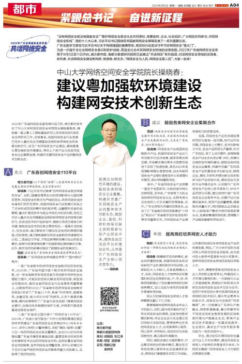 2022年广东省网络安全宣传周开启之际,南方都市报专访了中山大学网络空间安全学院院长操晓春教授。操晓春一直从事人工智能基础研究以及网络空间内容安全应用研究工作,在其看来,我国网络安全行业发展已经步入重点关注关键基础设施和新领域安全的变革创新时代。谈及广东网络安全产业建设,操晓春建议要加强软性环境建设,带动上下游产业与各类网络安全企业集聚发展,构建并完善网络安全产业的整体技术创新生态。