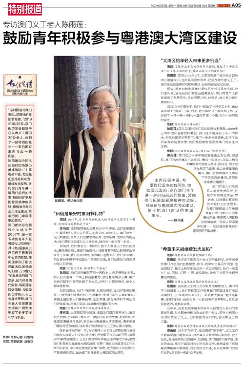 主席在信中说,希望我们坚持老有所为、继续发光发热,多向澳门青年讲一讲回归前后的故事,鼓励他们把爱国爱澳精神传承好,积极参与粤港澳大湾区建设,携手把澳门建设得更加美丽。 ——陈雨莲 “这封回信