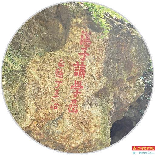 西樵山南麓的九龙岩至今留存着几处与湛若水、霍韬二人有关的遗迹。从“九龙岩”石刻路标处进去,未几,便可见湛子讲学岩。岩洞石壁上刻着“湛子讲学岩”五字,下款是“正德丁丑治”。岩洞不深,大概可容十来人。湛子洞位于湛子讲学岩不远处,位于两崖夹壁之间,陡峻如门,下有小泉缓泻,成流杯池。崖壁上“湛子洞”三字,是湛若水用茅龙笔挥写而成。