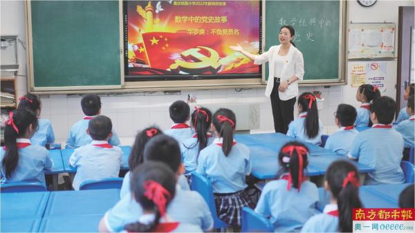 2022年5月5日,在重庆市九龙坡区铁路小学四年级二班的课堂上,数学老师牛俊懿通过讲述数学家华罗庚的故事开展党史教育活动。 新华社发