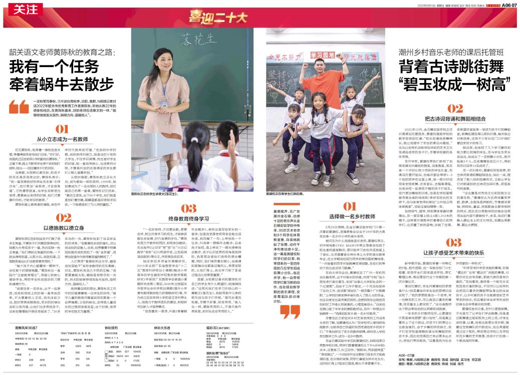 一支粉笔写春秋,三尺讲台育桃李。日前,南都、N视频记者对话2022年韶关市优秀教育工作者黄陈秋,听她从教22年的感受和经历。在黄陈秋看来,好的老师应该像太阳一样,“能够持续地发光发热,指明方向、温暖他人”。
