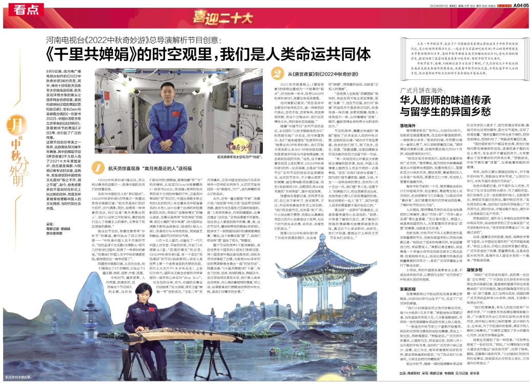 9月9日晚,由河南广播电视台制作的《2022中秋奇妙游》如约而至。其中,神舟十四号航天员陈冬太空连线送祝福、航天员刘洋弹古筝的镜头让很多网友倍感惊喜,表现钧瓷烧制过程的舞蹈《思钧如见君》、宝石Ge