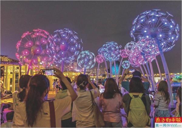 9月9日晚,香港东岸公园主题区,人们在欣赏维港海景的同时还能看到绚丽的中秋主题花灯。 南都拍客 林军 摄