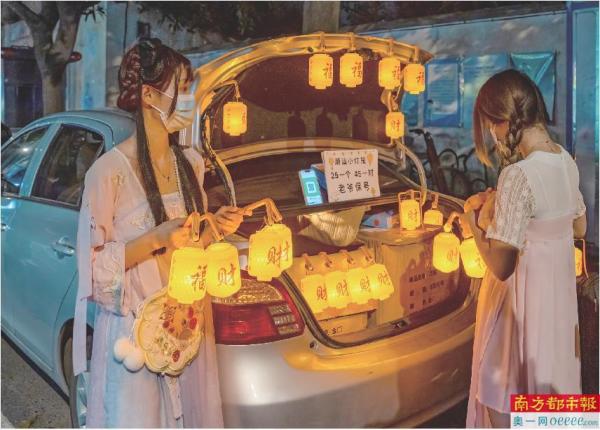 9月10日,广州永庆坊。车尾厢集市“夜经济”点燃老城区“烟火气”。摊主穿着汉服在售卖灯笼。 南都拍客 陈晓红 摄