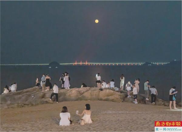 9月10日,中秋夜,港珠澳大桥“海豚塔”,一轮红月缓缓升起。珠海海滨泳场,不少市民来到沙滩赏月。 南都拍客 马红海 摄