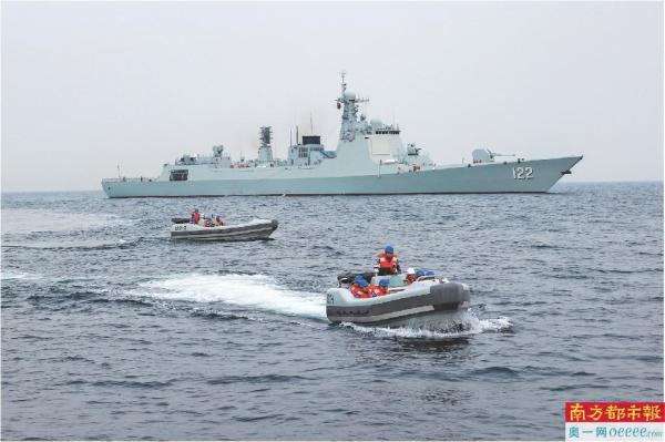 2. 北部战区海军某驱逐舰支队组织海上实战化训练,战舰派小艇前去支援“受损”舰艇。