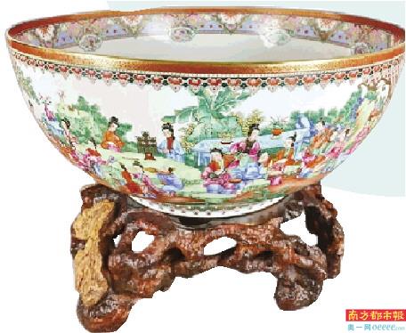 广彩曾是清宫贡品,现北京故宫仍藏有乾隆时的作品《品碗》、《凸珠琵琶瓶》。清中叶以后,因融入了西洋工艺,尤受西方青睐,皇室显贵纷纷来样订货,一跃而与青花、五彩并列我国三大外销名瓷,远销欧、美、亚三大洲100多个国家。