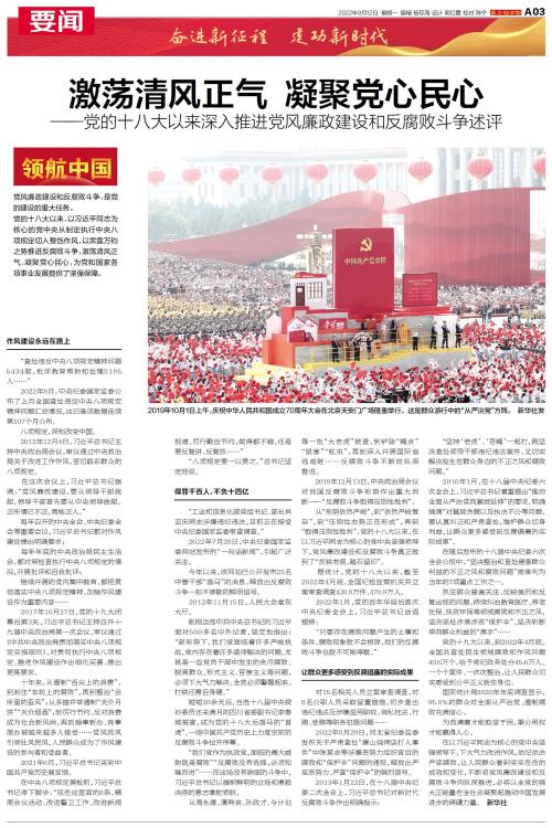 党风廉政建设和反腐败斗争,是党的建设的重大任务。 党的十八大以来,以习近平同志为核心的党中央从制定执行中央八项规定切入整饬作风,以雷霆万钧之势推进反腐败斗争,激荡清风正气、凝聚党心民心,为党和国