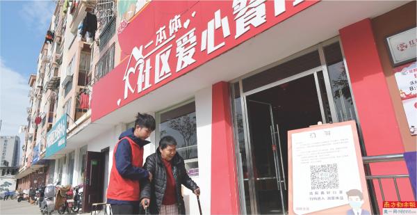 南昌市西湖区桃花镇河畔社区,志愿者搀扶一名行动不便的社区居民进入爱心餐厅就餐。近年来,桃花镇全额出资打造爱心餐厅,解决了困难群众做饭难问题。 新华社发