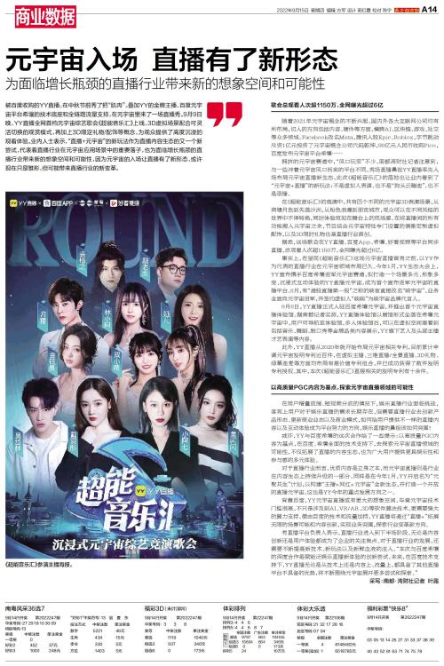被百度收购的YY直播,在中秋节前秀了把“肌肉”。叠加YY的金牌主播、百度元宇宙平台希壤的技术底座和全链路流量支持,在元宇宙里来了一场直播秀。9月9日晚,YY直播全网首档元宇宙综艺歌会《超能音乐汇》
