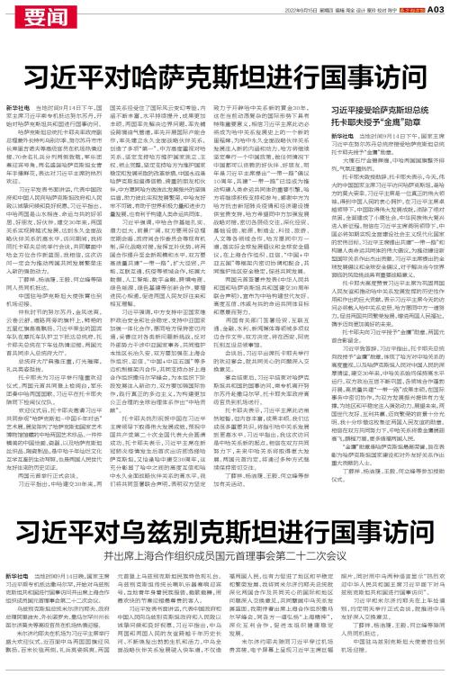 新华社电 当地时间9月14日晚,国家主席习近平乘专机抵达撒马尔罕,开始对乌兹别克斯坦共和国进行国事访问并出席上海合作组织成员国元首理事会第二十二次会议。 乌兹别克斯坦总统米尔济约耶夫、政府总理阿