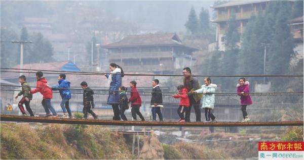 在位于广西融水苗族自治县和贵州省从江县交界的乌英苗寨,驻村工作队队员郑昌昊(右三)和支教的妻子吴晗(左五)带着孩子们玩耍。新华社发
