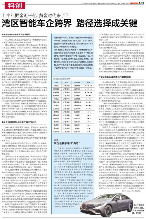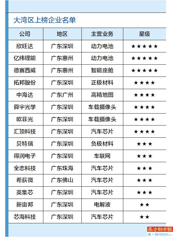 近日南都·湾财社发布的“智能汽车产业链掘金半年榜”,评选出51家“潜力企业”,其中15家入围企业来自粤港澳大湾区,营收总和为951.63亿元,净利润为52.67亿元。