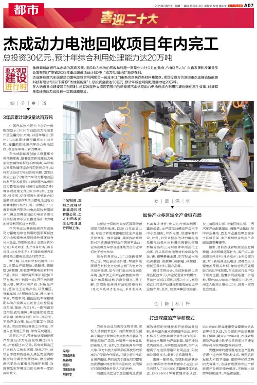 伴随着新能源汽车市场的高速发展,退役动力电池的回收与利用一直是业内外关注的焦点。今年3月,由广东省发展和改革委员会发布的《广东省2022年重点建设项目计划》中,“动力电池回收”赫然在列。 杰成新