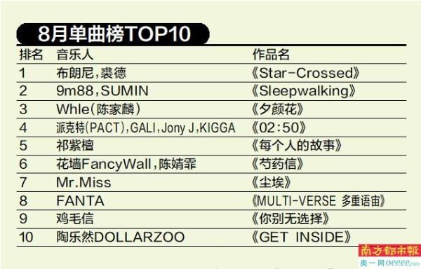8月单曲榜TOP10
