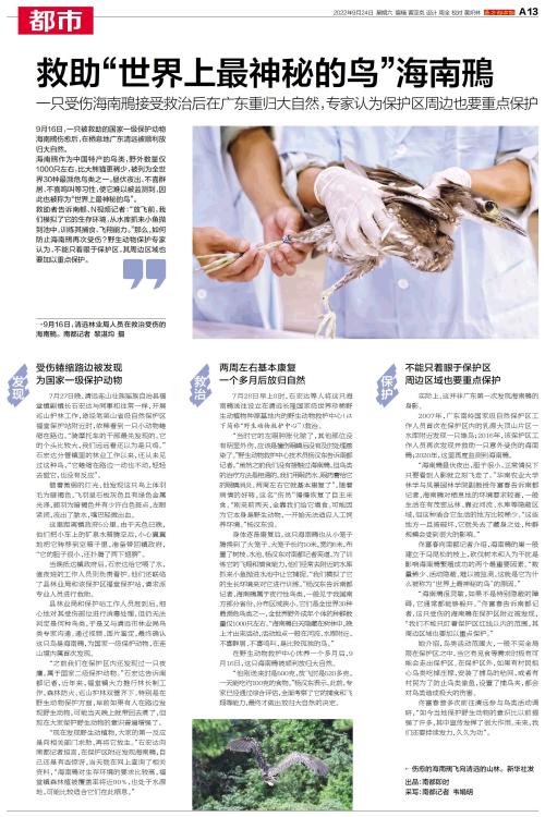 9月16日,一只被救助的国家一级保护动物海南鳽伤愈后,在栖息地广东清远被顺利放归大自然。 海南鳽作为中国特产的鸟类,野外数量仅1000只左右,比大熊猫更稀少,被列为全世界30种最濒危鸟类之一。昼