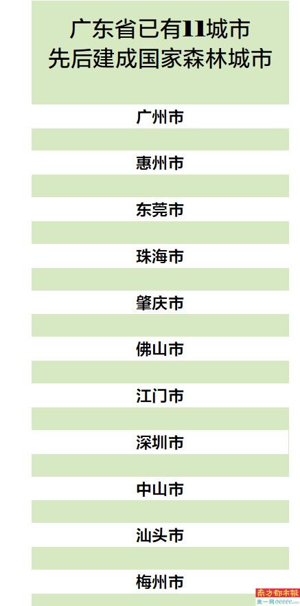 目前,广东全省21个地级以上市已全部加入“创森”行列,已建成11个国家森林城市。若茂名市、阳江市及韶关市此次获批准,广东被授予国家森林城市的地级市将达到14个。