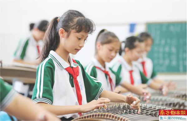 8月31日,为进一步落实“双减”政策,贵州省铜仁市玉屏侗族自治县第二小学学生在弹古筝。党的二十大相关工作进行网络征求意见,一些网友建议完善和落实“双减”政策,推动教育高质量发展,培养高质量人才。 新华社发