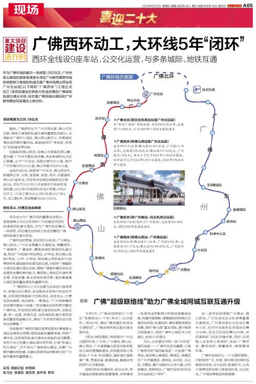 广佛环线的贯通,将实现白云机场、广州南站、佛山西站、广州北站等重大交通枢纽,佛肇城际、广佛南环、广清城际、穗莞深城际等城际轨道交通,规划广州地铁9号线西延、29号线,规划佛山地铁8号线、14号、15号线、规划佛山有轨电车T6线等城市轨道线路的快速互联互通,对服务广佛辐射大湾区轨道交通主动脉,增强广佛都市圈经济社会发展的支撑和带动能力,携领珠三角地区打造布局合理、功能完善、联系紧密的城市群,推动粤港澳大湾区高质量发展具有重要作用。