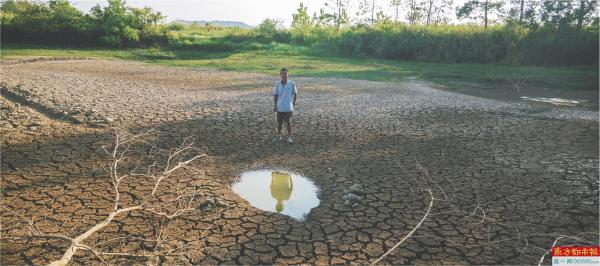 余望水站在自家的水塘中。塘水本身是用于灌溉水稻的,现在几近枯竭。