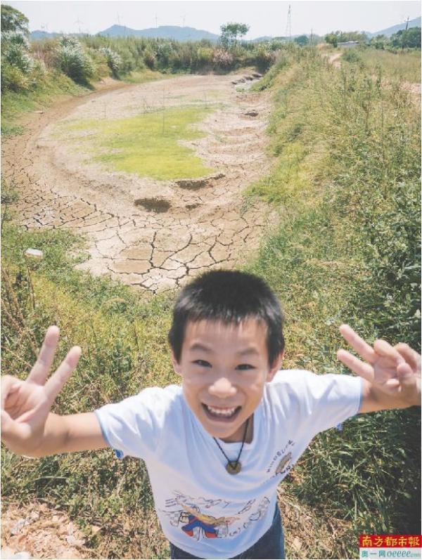 许盼云家的水塘干旱见底,孩子在附近玩耍。