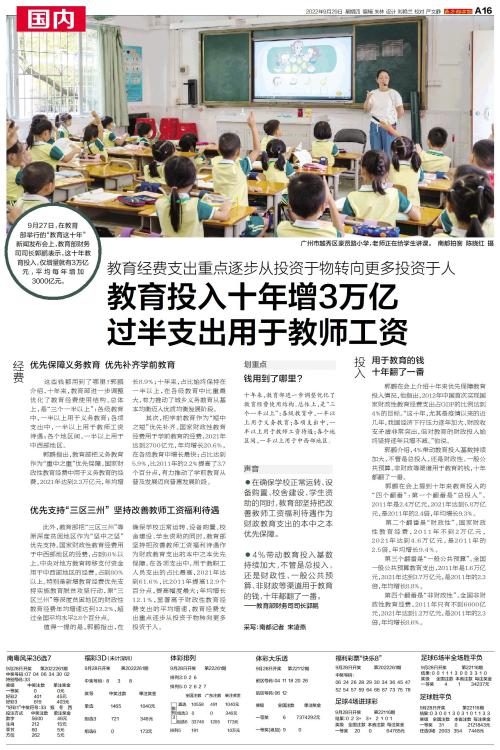 9月27日,在教育部举行的“教育这十年”新闻发布会上,教育部财务司司长郭鹏表示,这十年教育投入,仅增量就有3万亿元,平均每年增加3000亿元。 经费 优先保障义务教育 优先补齐学前教育 这