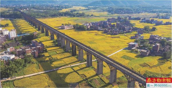 云浮罗定长岗坡渡槽,金黄稻田丰收在望。