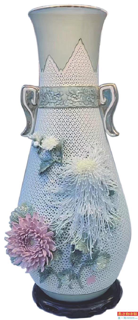 “日啖荔枝三百颗,不辞长作岭南人。”在照片下方的展柜中,陶瓷捏制的荔枝栩栩如生,这是一件佛山石湾陶艺《满堂红》。此外,像西关趟栊门摆件、潮瓷通花瓶《琵琶寄菊》等文艺精品,也纷纷亮相广东单元传统文化板块。