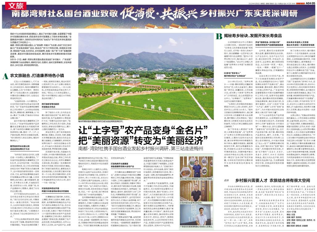 9月19-21日,南都·湾财社携手国台酒业发起的“乡村振兴 广东实践”深调研第三站走进梅州,调研白马村、百美村、桂岭文旅等案例,涉及种源培训、乡村文旅、研学旅游等内容。