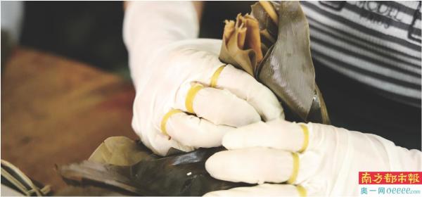 “裹蒸粽不是月饼,没法用纯机器加工,人手包制是必经工序”,这是所有裹蒸粽厂老板都会告诉你的一句话。在肇庆每个裹蒸粽工厂里,都有数以百计的包粽工人,人均每天手包上千个粽子不在话下。