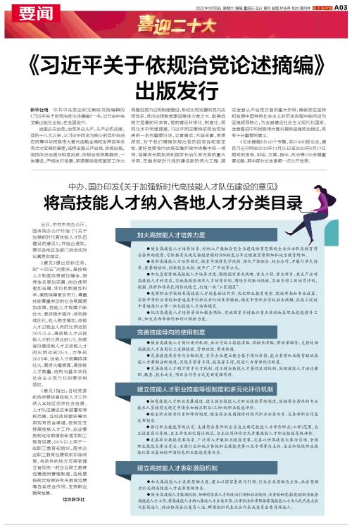 近日,中共中央办公厅、国务院办公厅印发了《关于加强新时代高技能人才队伍建设的意见》,并发出通知,要求各地区各部门结合实际认真贯彻落实。 《意见》提出目标任务,到“十四五”时期末,高技能人才制度政