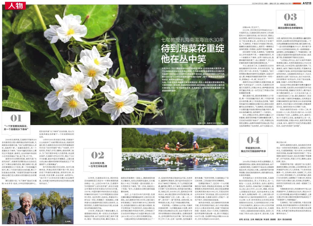 时隔30年,海菜花又在洱海开放。 孔海南与学生在洱海工作。 孔海南。 8月28日,2022推进全球生态文明建设(洱海)论坛在