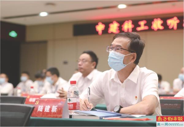 中建科工组织集体收听收看党的二十大开幕实况直播,首席专家陆建新在认真记录。 受访者供图