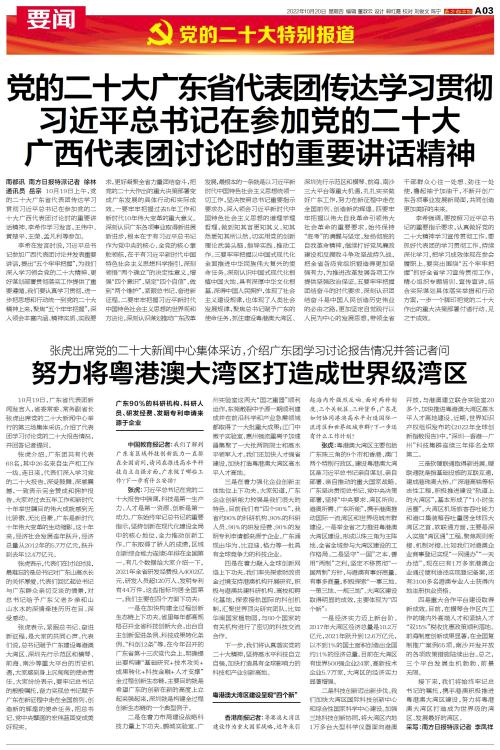 党的二十大广东省代表团传达学习贯彻习近平总书记在参加党的二十大广西代表团讨论时的重要讲话精神。