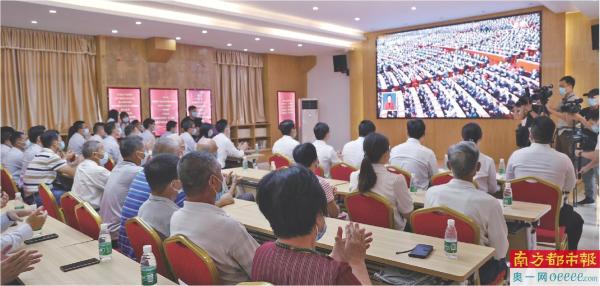 10月16日,佛山顺德北滘黄龙村,70多名党员干部、群众代表集体收听收看党的二十大开幕会。