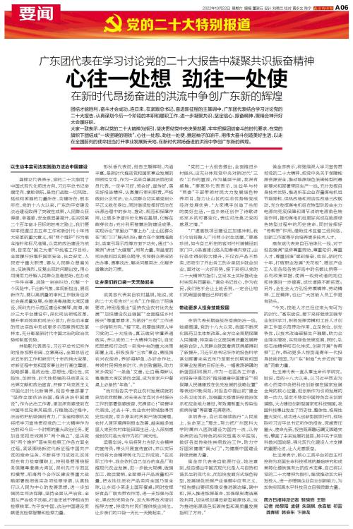 连日来,广东团代表结合学习讨论党的二十大报告,认真谋划今后一个阶段的本职和履职工作。