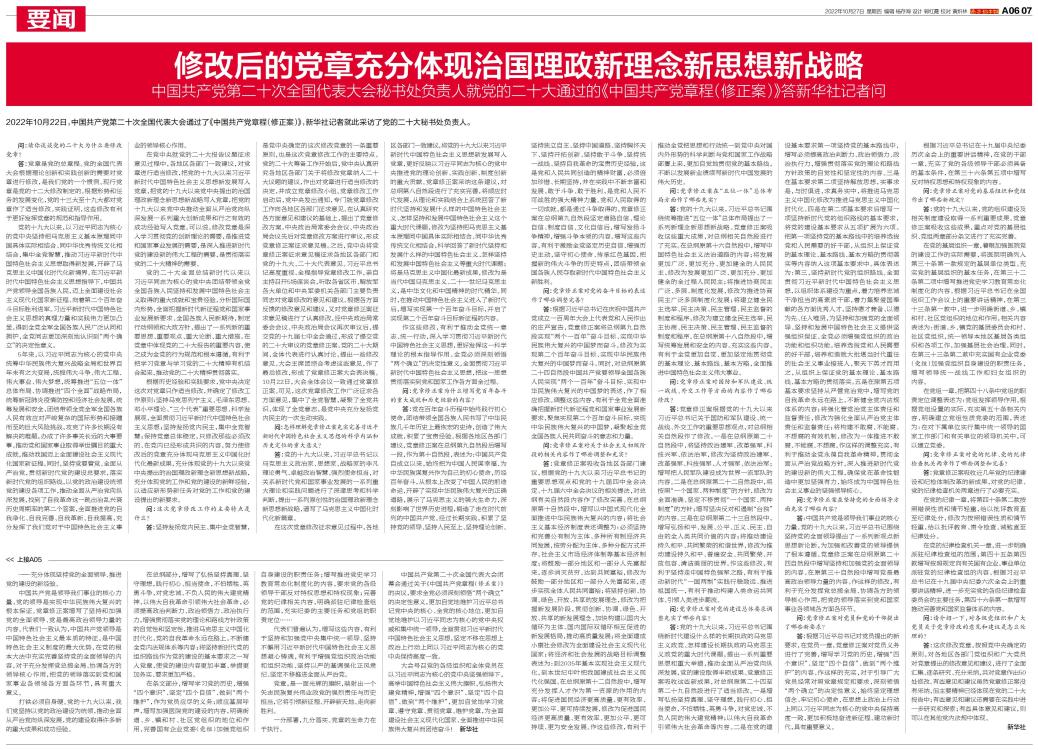 2022年10月22日,中国共产党第二十次全国代表大会通过了《中国共产党章程(修正案)》,新华社记者就此采访了党的二十大秘书处负责人。