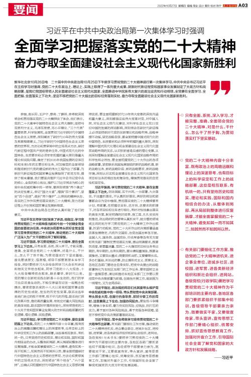 二十届中共中央政治局10月25日下午就学习贯彻党的二十大精神进行第一次集体学习。