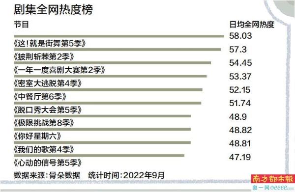 9月综艺全网热度前十榜中,《这!就是街舞第5季》和《披荆斩棘第2季》依然稳坐第一与第二的宝座。9月下旬才开播的《一年一度喜剧大赛第2季》深受观众喜爱,很快就冲到了第三名的位置。《密室大逃脱第4季》和《中餐厅第6季》热度平稳,跻身前五。《脱口秀大会第5季》自8月30日上线以来,在赞美和批评声中前行。
