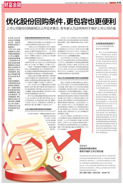 证监会方面表示,为更好顺应市场实际和公司需求,进一步提升回购的制度包容性和实施便利性,遂结合实践情况,对《回购规则》 部分条款予以优化。市场分析称,这将推动上市公司进一步强化对中小股东权益保护的主体责任。